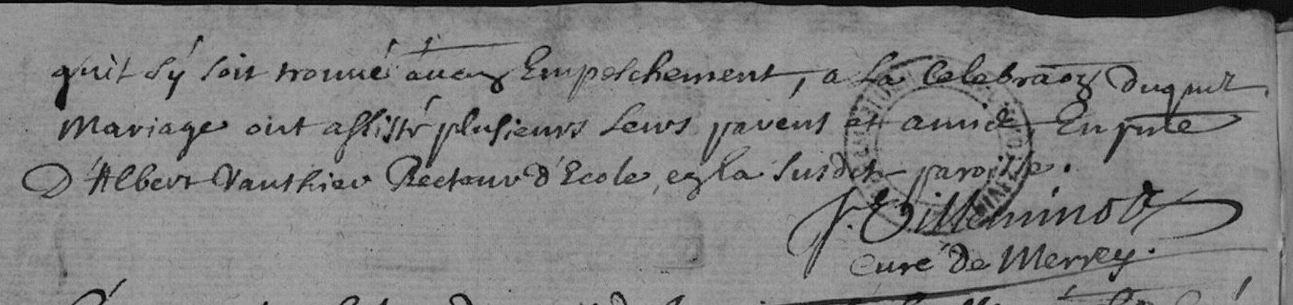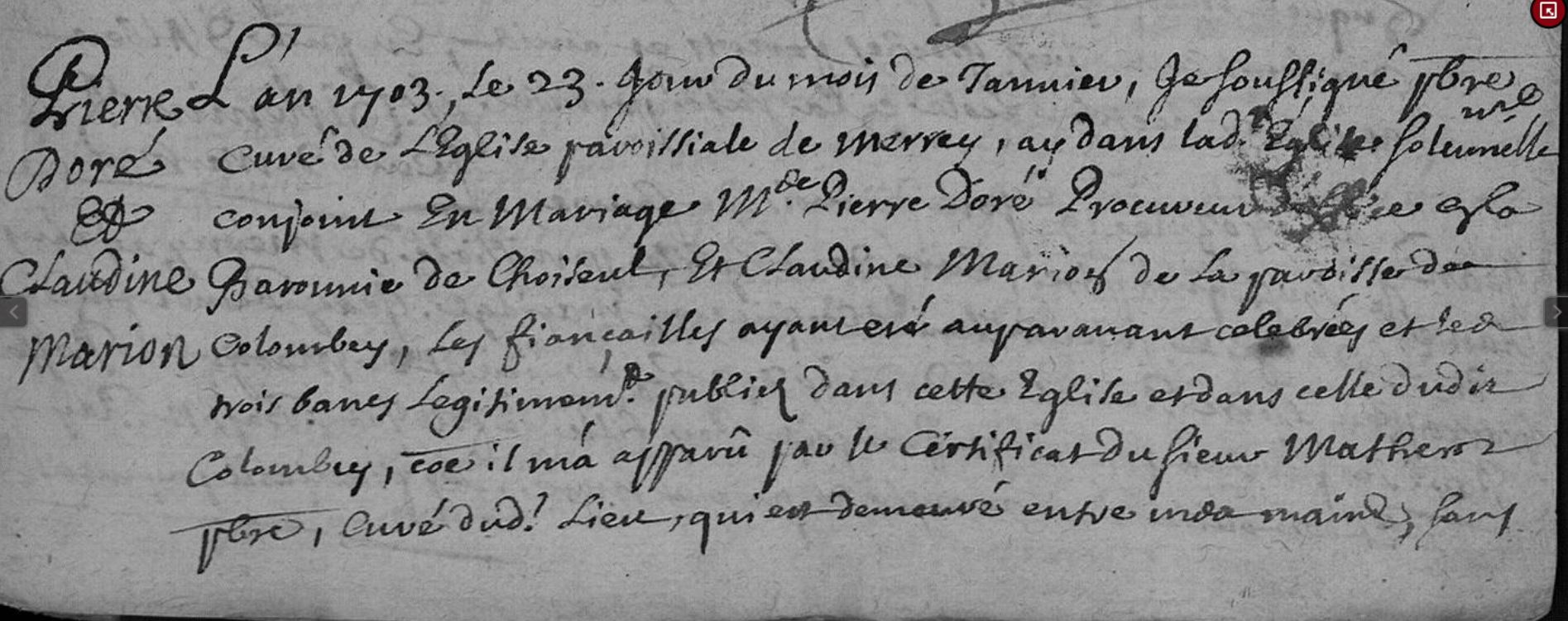| Union | Jeanne Poitral | Commune : Chaumont (St-Agnan) Département : Haute-Marne Date de l'acte : 20/01/1688 Epoux : Nom de l'époux : DORÉ Pierre Commentaire : dmt à Choiseul Veuf / conjoint de : DROUOT Anne Commentaire : † Parents : Nom du père : Nom de la mère : Epouse : Nom de l'épouse : POITRAL Jeanne Commentaire : dmt à Mairey (21) ? Veuve / conjoint de : DROUOT Claude Commentaire : † Parents : Nom du père : Nom de la mère : Références : Commentaire général : Dispense de deux bans et d'affinité spirituelle, l'épouse ayant été marraine d'un enfant de l'époux et d'Anne DROUOT sa première épouse. Accès photo AD52 : Edepot002G161_01_0075 Document1 , page 75/135 | Mariage (plus...) | 20 janvier 1688 à l'âge de 47 ans | Chaumont, Haute-Marne, FRANCE (, Chaumont, 52121, Haute Marne, Grand-Est, France) |