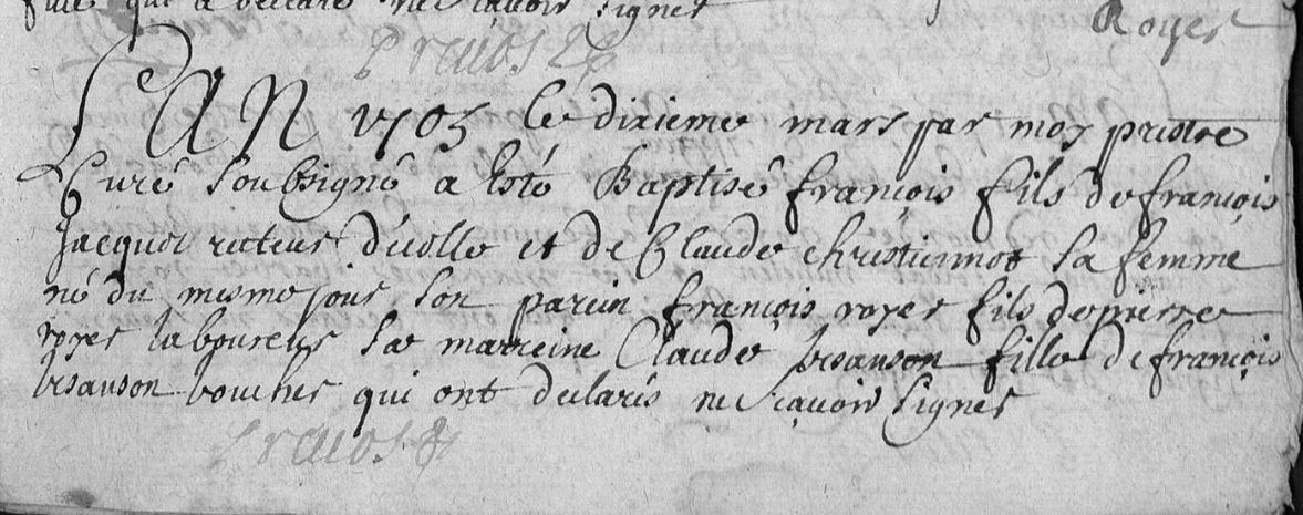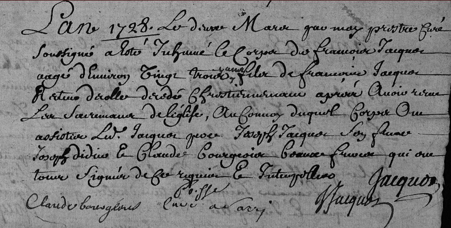 | Prénom | François | | Nom de famille | Jacquot | | Naissance | 10 mars 1705 | Val-de-Meuse, Haute-Marne, FRANCE (, Montigny-le-Roi, 52332, Haute Marne, Grand-Est, France) | | Baptême | 10 mars 1705 | Val-de-Meuse, Haute-Marne, FRANCE (, Montigny-le-Roi, 52332, Haute Marne, Grand-Est, France) | | Décès | 1 mars 1728 à l'âge de 23 ans | Sarrey, Haute-Marne, FRANCE (, Sarrey, 52461, Haute Marne, Grand-Est, France) | | Sépulture | 2 mars 1728 | Sarrey, Haute-Marne, FRANCE (, Sarrey, 52461, Haute Marne, Grand-Est, France) |
