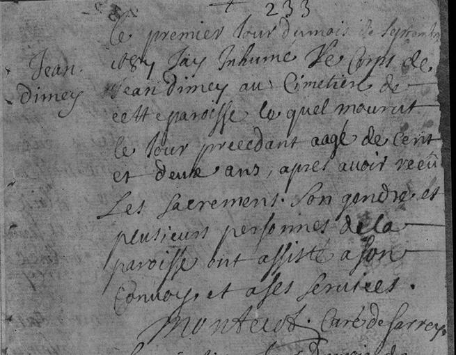 Le premier jour du mois de septembre ... j'ay inhumé le corps de Jean Dimey au cimetierre de cette paroisse lequel mourut le jour précédant agé de Cent et deux ans apres avoir recu les sacrements. Son gendre et plusieurs personnes de la paroisse ont assisté à son ... et a ses....
