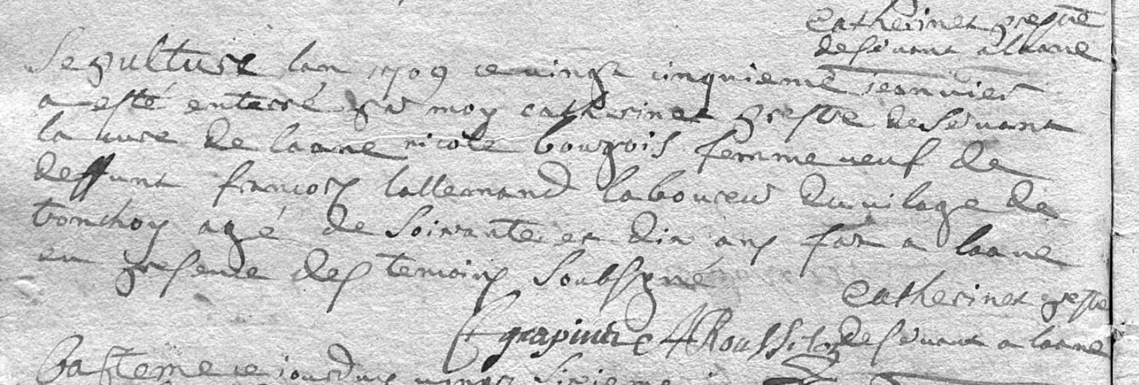 | Prénom | Nicole | | Nom de famille | Bourgeois | | Naissance | 7 février 1642 | Rolampont, Haute-Marne, FRANCE (, Lannes, 52432, Haute Marne, Grand-Est, France) | | Baptême | 7 février 1642 | Rolampont, Haute-Marne, FRANCE (, Lannes, 52432, Haute Marne, Grand-Est, France) | Déclarée 'femme veuf de deffunt francois lallemand laboureur du vilage de tronchoy agé de soixante et dix ans'. | Décès (plus...) | 25 janvier 1709 à l'âge de 67 ans | Rolampont, Haute-Marne, FRANCE (, Lannes, 52432, Haute Marne, Grand-Est, France) | Témoins Décès | Témoin François Grapinet Témoin André Rousselot 2430 (28 mars 1664 - 15 octobre 1726)