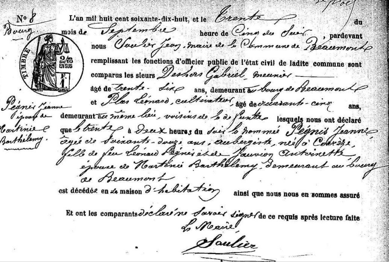 | l'an mil huit cent soixante-dix-huit, et le trente du mois de septembre heure de cinq du soir, pardevant nous Soulier Jean, maire de la commune de Beaumont remplissant les fonctions d'officier public de l'état civil de ladite commune sont comparus les sieurs Deshers Gabriel, meunier âgé de trente-six ans, demeurant au bourg de Beaumont et Plas Léonard, cultivateur, âgé de quarante-cinq ans, demeurant au même lieu, voisins de la deffunte lesquels nous ont déclaré que le trente à deux heures du soir ,a nommée Pégnis Jeanne âgée de soixante-douze ans, aubergiste, née à Corrèze ville de feu Léonard Pégnis et de Jauvion Antoinette, épouse de Martini Barthélemy, demeurant au bourg de Beaumont est décédée en sa maison d'habitation ainsi que nous nous en sommes assuré