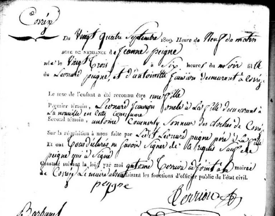Acte de Naissance de Jeanne Peigne née le vingt trois à six heures du soir fille de Léonard Peigne et d'Antoinette Jauvion demeurant à Corrèze