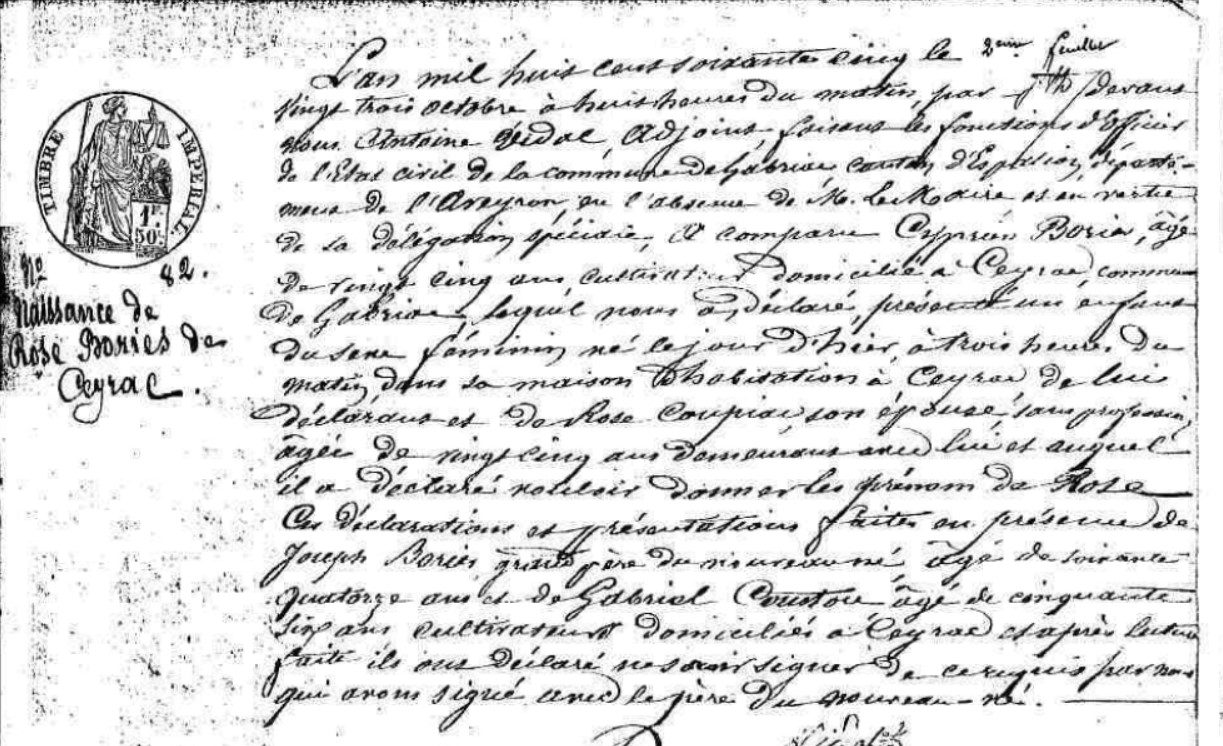 | Prénom | Rose | | Nom de famille | Bories | | Profession | Cuisinière | l'an mil huit cent soixante cinq le vingt trois octobre à huit heures du matin, pardevant nous Antoine Vidal, adjoint faisant les fonctions d'officier de l'état civil de la commune de Gabriac, canton d'Espalion, département de l'Aveyron, en l'absence de Mr le maire est en vertu de la délégation spéc... a comparu Cyprien Bories âgé de vingt cinq ans cultivateur domicilié à Veyrac, commune de Gabriac, lequel nous a déclaré prés... un enfant de sexe féminin né le jour d'hier à trois heures du matin dans sa maison d'habitation à Ceyrac de lui déclarant et de Rose Coupiac son épouse, sans profession âgée de vingt cinq ans demeurant ..... et auquel il a déclaré vouloir donner le prénom de Rose. Ces déclarations et présentations faites en présence de Jacques Bories grand père du nouveau né, âgé de soixante quatorze ans et de Gabriel Coustou âgé de cinquante six ans, cultivateur domicilié à Ceyrac et après lecture faite ils ont déclaré ne savoir signer de ce requis par nous qui avons signé avec le père du nouveau-né | Naissance (plus...) | 20 octobre 1865 | Gabriac, Aveyron, FRANCE (, Gabriac, 12106, Aveyron, Occitanie, France) | Témoins au Bapteme/Naissance | Témoin Gabriel Coustou (1809) Grand père Cyprien Bories (1840)