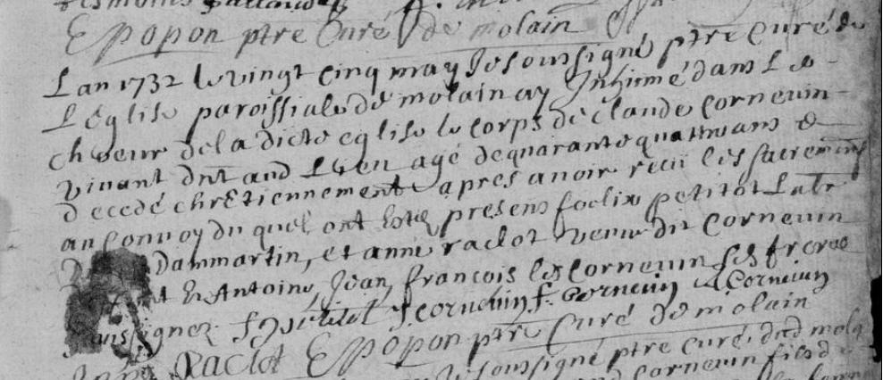 L'an 1732 le vingt cinq may je soussigné pretre curé de l'église paroissialle de Molain ay inhumé dans le choeur de la ditte église le corps de Claude Cornevin vivant ... agé de quarante quatre ans décédé chretiennement apres avoir recu kes sacrements ... ont été présens Felix Petitot laboureur de Dammartin et Anne Raclot veuve de Cornevin et Antoine, Jean François ... Cornevin ses freres soussigné...