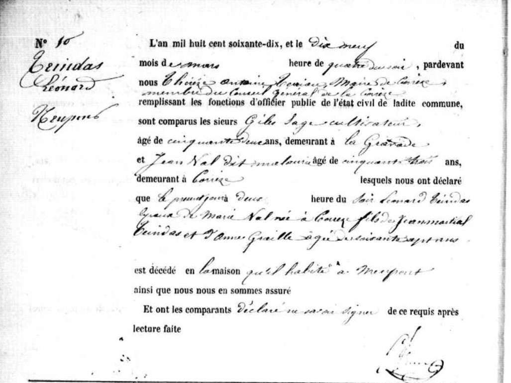 | Prénom | Léonard | | Nom de famille | Teindas | | Naissance | 1 octobre 1803 | Corrèze, Corrèze, FRANCE (Neupont, Corrèze, 19062, Corrèze, Nouvelle-Aquitaine, France) | | Décès | 9 mars 1870 à l'âge de 67 ans | Corrèze, Corrèze, FRANCE (, Corrèze, 19062, Corrèze, Nouvelle-Aquitaine, France) |