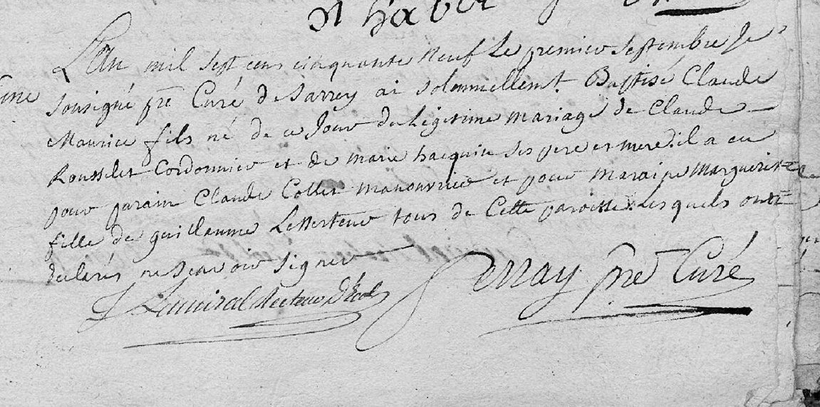 | Prénom | Claude Maurice | | Nom de famille | Rousselet | L'an mil sept cent cinquante neuf le premier septembre soussigné ... Curé de Sarrey ai solennellement Baptisé Claude Maurice fils né de ce jour du légitime mariage de Claude Rousselet Cordonnier et de Marie Haquin ses pere et mere i a eu pour parrain Claude Cottes manouvrier et pour Marraine Marguerite fille de Guillaume Lesserteur tous de cette paroisse lesquels ont déclarés ne savoir signer | Naissance (plus...) | 1 septembre 1759 | Sarrey, Haute-Marne, FRANCE (, Sarrey, 52461, Haute Marne, Grand-Est, France) | | Baptême | 1 septembre 1759 | Sarrey, Haute-Marne, FRANCE (, Sarrey, 52461, Haute Marne, Grand-Est, France) |