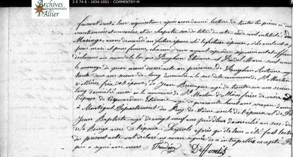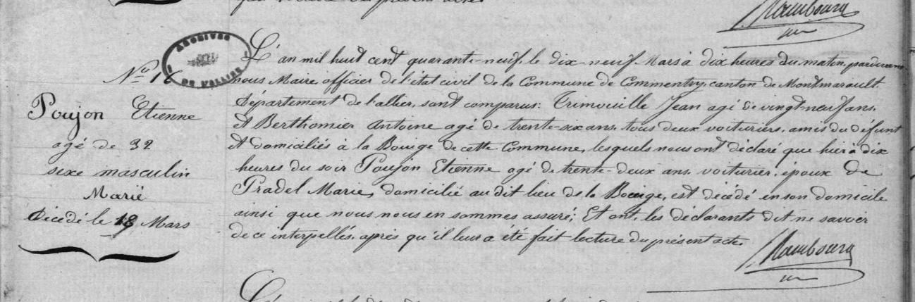 | L'an mil huit cent quarante neuf le dixneuf mars à deux du matin pardevant nous Maire officier de la commune de Commentry Canton de Montmarault Département de l'Allier sont comparus Trimouille Jean agé de vingt neuf ans et Berthomier Antoine agé de trente six ans, tous deux voituriers amis du défunt et domicilés à la Bouige de cette commune, lesquels nous ont déclaré que hier à dix heures du soir Poujon Etienne agé de trente deux ans voiturier époux de Pradel Marie domicilié audit lieu de la Bouige est décédé en son domicile ainsi que nous nous en sommes assurés; et ont, les déclarants dit ne savoir de ce interpellé après qu'il leur a été fait lecture du présent acte | Décès (plus...) | 18 mars 1849 à l'âge de 30 ans | Commentry, Allier, FRANCE (, Commentry, 03082, Allier, Auvergne-Rhône-Alpes, France) |