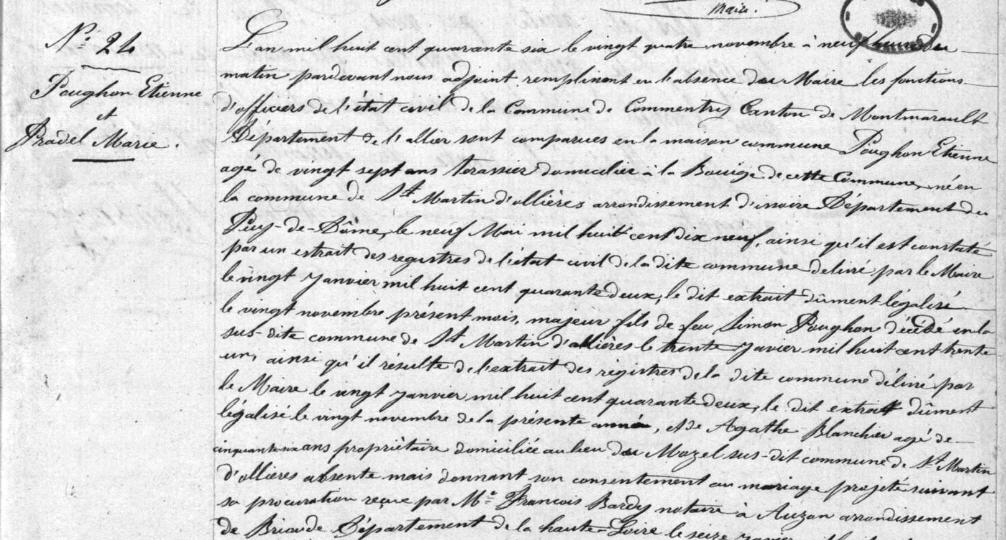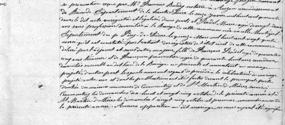 | Union | Marie Pradel 77 (1 décembre 1825 - 27 août 1871) | L'an mil huit cent quarante six, le vingt quatre novembre à neuf heure du matin par devant nous adjoint remplacant en l'absence du maire, les fonctions d'officier de l'état civil de la commune de commentry canton de Montmarault Département de l'Allier sont comparus en la maison commune Poujon Etienne agé de vingt sept ans terrassier domicilié à la bouige de cette commune, né en la commune de Saint Martin d'Ollières arrondissement d'Issoire Département du Puy de dôme, le neuf mai mil huit cent dixneuf ainsi qu'il est constaté par un extrait des registres de l'état civil de la dite commune delivré par le Maire le vingt janvier mil huit cent quarante deux, le dit extrait dument légalisé le vingt novembre présent mois, majeur fils de feu simon Poujon décédé en la dite commune de saint martin d'ollières le trente janvier mil huit cent trente et un ainsi qu'il résulte de l'extrait des registres de la dite commune délivré par le Maire le vingt janvier mil huit cent quarante deux, le dit extraitdument légalisé le vingt novembre de la présente année. et de Agathe Blanchet agée de cinquante six ans proprietaire domicilié au lieu di Mazet sus-dit commune de saint martin d'ollières absente mais donnant son consentement au mariage projeté suivant sa procuration reçue par M. François Barchy notaire à Auzon arrondissement de Briende Département de la Haute Loire le seize janvier mil huit cent quarante deux le dit acte enregistré et légalisé, d'une part; et Pradel Marie agée de vingt deux ans, sans profession domiciliée à la bouige de cette commune née en celle de montégut département du Puy de dôme le quinze mars mil huit cent vingt quatre ainsi qu'il est constaté par l'extrait des registres de l'état civil de cette commune délivré par l'adjoint et sans date, majeur, fille de Francois Pradel agé de quarante cinq ans terrassier et de Françoise Pannertier agée de quarante huit ans, revendeuse, domiliés ensemble au dit lieu de la bouige ci-présent et consentant au mariage projeté, d'autre part lequels nous on requis de procédé à la célébration du mariage projeté entre eux et dont les publications ont été faites devant la principale porte d'entrée des maisons communes de Commentry et de Saint Martin d'Ollières, savoir à Commentry les dimanches dix huit et vingt cinq octobre de la présente année et à Saint Martin d'Ollières les dimanches vingt cinq octobre et premier novemvre aussi de la présente année. Aucune opposition au dit mariage ne nous ayant été signifié faisant droit à la réquisition après avoir donné lecture de toutes les pièces ci-dessus mentionnées et annexées et du chapitre six du titre du... code civil intitulé : Du Mariage, avons demandé au futur époux et à la future épouse s'ils veulent se prendre pour mari et pour femme, chacun d'eux ayant répondu séparement et affirmativement déclarons au nom de la loi que Poujon Etienne et Pradel Marie sont unis par le mariage de quoi nous avons dressé acte en présence de Poujon Antoine agé de trente deux ans scieur de long domicilié à la susdite commune de Saint Martin d'Ollières frère de l'époux | Mariage (plus...) | 24 novembre 1846 à l'âge de 27 ans | Commentry, Allier, FRANCE (, Commentry, 03082, Allier, Auvergne-Rhône-Alpes, France) | Témoins au Mariage | Frère Antoine Poujon (25 juin 1814)