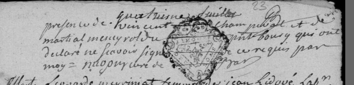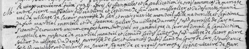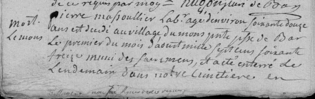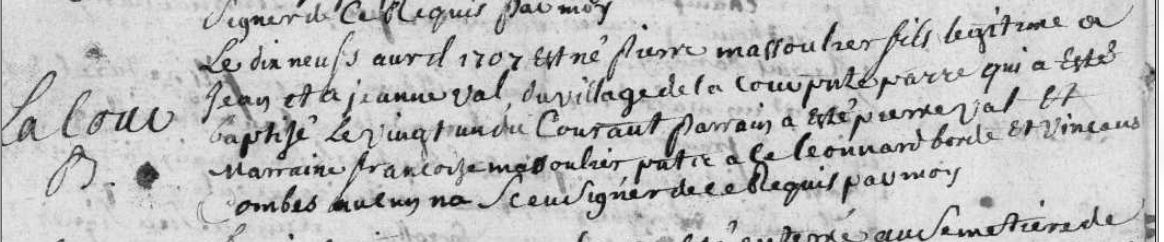 | Prénom | Pierre | | Nom de famille | Massoulier | | Profession | Laboureur | Le dix neuf avril 1707 est né Pierre Massoulier fils légitime de Jean et à Jeanne Val du village de la ... qui a été baptisé le vingt un du courant, Parrain a été Pierre Val et Marraine Françoise Massoulier ... Léonnard Borde et Vincent Combes... | Naissance (plus...) | 19 avril 1707 | Bar, Corrèze, FRANCE (, Bar, 19016, Corrèze, Nouvelle-Aquitaine, France) | | Baptême | 21 avril 1707 | Bar, Corrèze, FRANCE (, Bar, 19016, Corrèze, Nouvelle-Aquitaine, France) | Pierre Massoulier Laboureur agé d'environ soixante douze ans est décédé au village du Mons ... de Bar le premier du mois d'Aout mille sept cent soixante treize muni des sacrements et a été enterré le lendemain dans notre cimetierre en présence de vincent Champeval et de Martial Meneyrol .. du bourg qui ont déclaré ne savoir signer de ce requis par moy | Décès (plus...) | 1 août 1773 à l'âge de 66 ans | Bar, Corrèze, FRANCE (, Bar, 19016, Corrèze, Nouvelle-Aquitaine, France) |