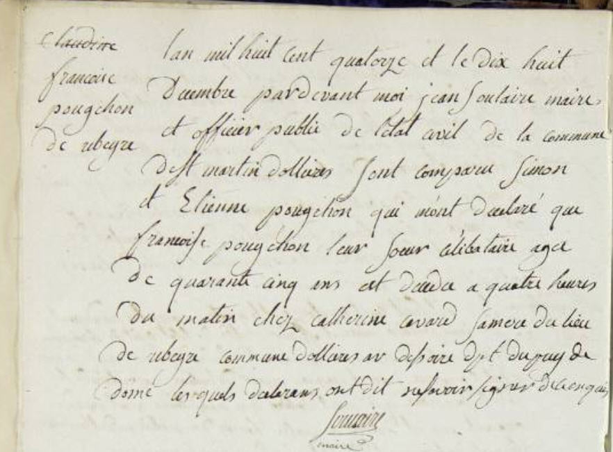 | Prénom | Françoise | | Nom de famille | Poujon | | Naissance | 24 mai 1773 | Saint-Martin-d'Ollières, Puy-de-dôme, FRANCE (Ribeyre, Saint-Martin-d'Ollières, 63376, Puy de Dôme, Auvergne-Rhône-Alpes, France) | | Baptême | 24 mai 1773 | Saint-Martin-d'Ollières, Puy-de-dôme, FRANCE (, Saint-Martin-d'Ollières, 63376, Puy de Dôme, Auvergne-Rhône-Alpes, France) | | Décès | 18 décembre 1814 à l'âge de 41 ans | Saint-Martin-d'Ollières, Puy-de-dôme, FRANCE (, Saint-Martin-d'Ollières, 63376, Puy de Dôme, Auvergne-Rhône-Alpes, France) | Témoins Décès | Témoin Simon Poujon 152 (1 avril 1776 - 30 janvier 1831) Témoin Etienne Poujon (27 avril 1782)