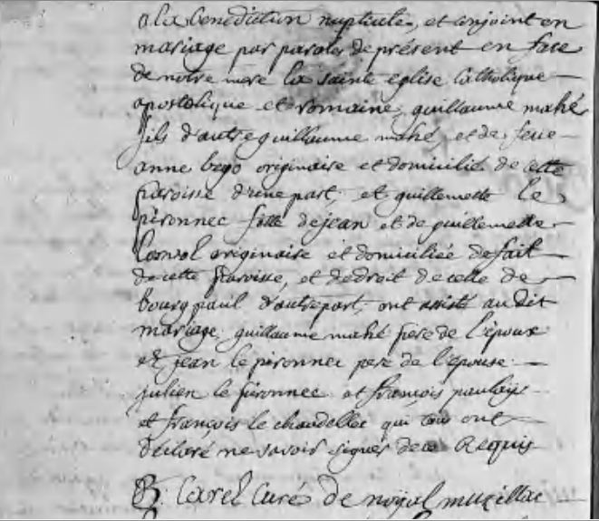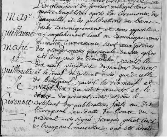 Le onzieme jour de janvier mil sept cent quatre vingt trois apres la cérémonie des fiancailles et les publications des bans faites canoniquement et sans opposition n'y empechement civil ou canonique venus à notre connaissance, tenut aux... des grands messes paroissiales de ce cette église par trois jours de dimanche savoir le dix neuf, vingt six de janvierre de.... et le neuf du présent mois que de celle de Bourg-Paul savoir le dix neuf et vingt six du susdit janvier et le deux du présent mois et vu le certificat des publications faites au dit Bourg-Paul en datte de l'onze du présent mois signé françois guiot curé de bourg paul muzillac ont été admis à la bénédiction et conjoint en mariage par paroles de présent en ... apostolique et romaine, Guillaume Mahé fils d'autre Guillaume Mahé et de feue Anne Bego, originaire et domicilié de cette paroisse d'une part, et Guillemette le pironnec fille de Jean et de Guillemette Lornol originaire et domiciliée de fait de cette paroisse et de droit de celle de Bourg Paul d'autre part, ont assisté au dit mariage Guillaume Mahé frère de l'epoux et Jean le Pironnec pere de l'épouse, Julien Le pironnec et françois Paulay et François le Chaudellec qui tous ont déclaré ne savoir signé de ce requis