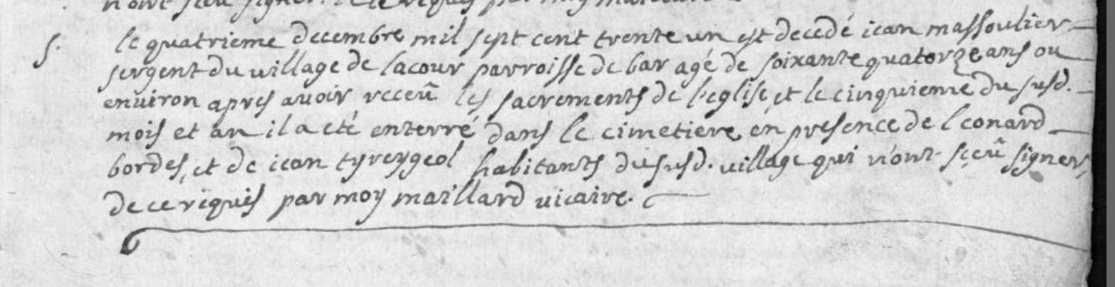 | Prénom | Jean | | Nom de famille | Massoulier | | Profession | Sergent de la Juridiction | | Décès | 4 décembre 1731 | Bar, Corrèze, FRANCE (, Bar, 19016, Corrèze, Nouvelle-Aquitaine, France) | | Sépulture | 4 décembre 1731 | Bar, Corrèze, FRANCE (, Bar, 19016, Corrèze, Nouvelle-Aquitaine, France) |