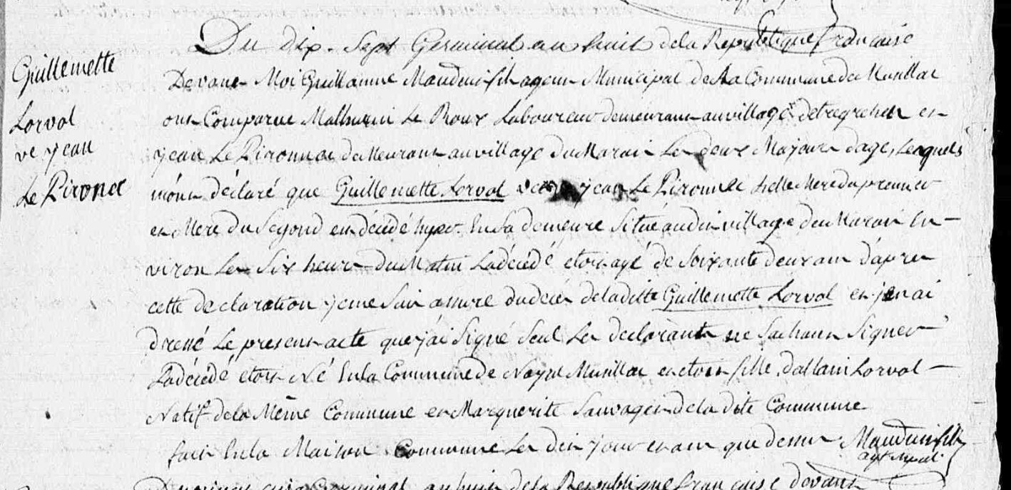 | Du dix sept germinal an huit de la république française devant moi Guillaume Maud.... .... municipal de la commune de Muzillac ont comparus Mathurin Leroux laboureur demeurant au ... et Jean Le Pironnec demeurant au village du Marais, les deux ma... ...lesquels n'ont déclaré que Guillemette Lorvol vve de Jean Le Pironnec ... .... ... ... du .... est décedée hyer en sa demeure située audit village du marais en- viron les six heures du matin. la décedée était âgée de soixante deux ans d'après cette déclaration ... .... ... du décès de laditte Guillemette Lorvol et j'en ai dressé le présent acte que j'ai signé seul les déclarants ne sachant signer la décedée etait né sur la commune de Noyal-Muzillac et était fille d'Allain Lorval natif de la même commune et de Marguerite Sauvaget de la dite commune ... en la maison commune du dit jour et an que .... | Décès (plus...) | 6 avril 1800 à l'âge de 62 ans | Muzillac, Morbihan, FRANCE (, Muzillac, 56143, Morbihan, Bretagne, France) |