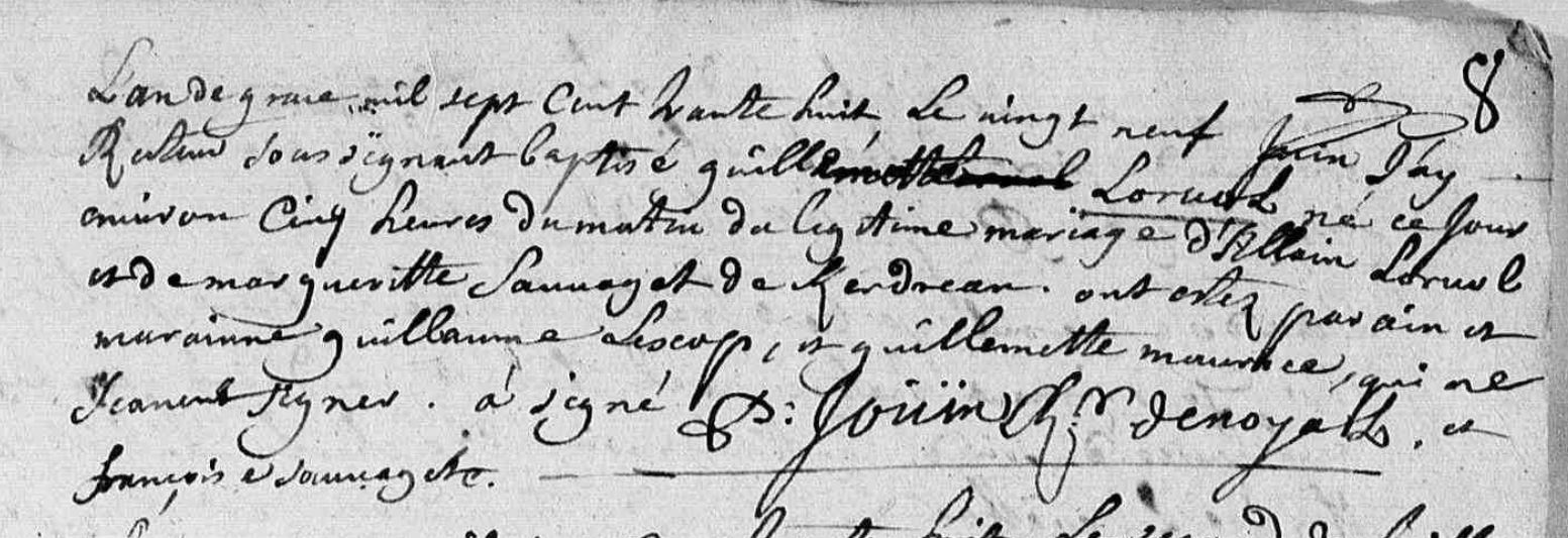 | Prénom | Guillemette | | Nom de famille | Lorvol | | Naissance | 29 juin 1738 | Noyal-Muzillac, Morbihan, FRANCE (Kerdrean, Noyal-Muzillac, 56149, Morbihan, Bretagne, France) | | Baptême | 29 juin 1738 | Noyal-Muzillac, Morbihan, FRANCE (, Noyal-Muzillac, 56149, Morbihan, Bretagne, France) | Témoins au Bapteme/Naissance | Parrain Guillaume Lescops Marraine Guillemette Maurice