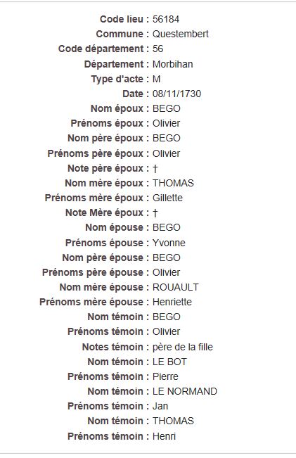 | Prénom | Yvonne | | Nom de famille | Bego | | Naissance | 28 septembre 1711 | Questembert, Morbihan, FRANCE (Kerbelay, Questembert, 56184, Morbihan, Bretagne, France) | | Décès | 11 juillet 1738 à l'âge de 27 ans | Questembert, Morbihan, FRANCE (, Questembert, 56184, Morbihan, Bretagne, France) |
