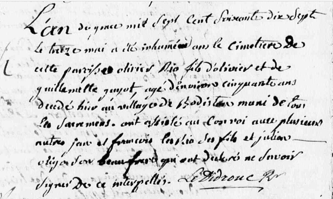 | l'an de grace mil sept cent soixante dix sept le treize mai a été inhumée dans le cimetiere de cette paroisse Olivier Rio fils d'Olivier et de Guillemette Guyot, agé d'environ cinquante ans decedé hier au village de Bosdiston muni de tous les sacremens. ont assisté au convoi avec plusieurs autres Jan et François ... Rio ses fils et Julien Oligo son beau frère qui ont déclarés ne savoir signer de ce interpellés | Décès (plus...) | 12 mai 1777 à l'âge de 53 ans | Marzan, Morbihan, FRANCE (Bodistan, Marzan, 56126, Morbihan, Bretagne, France) | Témoins Décès | Témoin Julien Oligo Témoin Jean Ryo (1755) Témoin François Ryo