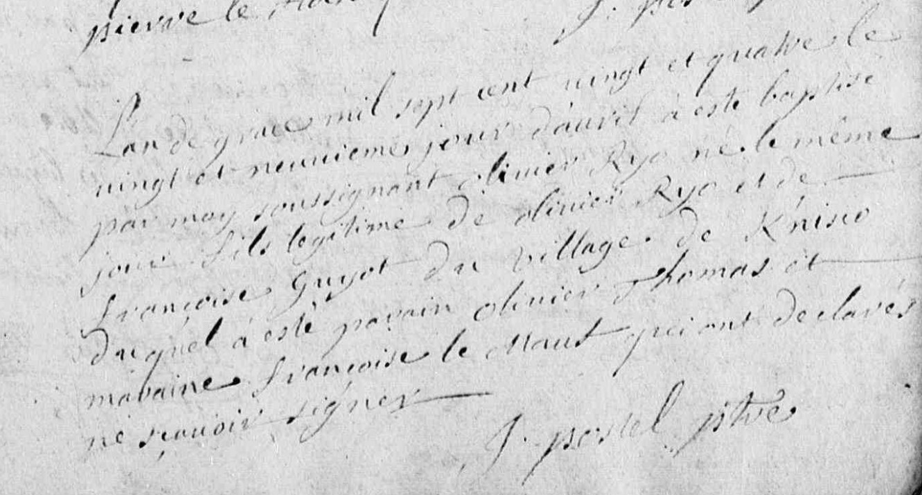 | Prénom | Olivier | | Nom de famille | Ryo | | Profession | Gens de labeur | l'an de grace mil sept cent vingt quatre le vingt et neuvieme jour d'avril a esté baptisé par moy soussignant Olivier Ryo né le même jour fils légitime de Olivier Ryo et de Françoise Guyot du village de K'niro duquel a esté parain Olivier Thomas et maraine Françoise le Maut qui ont déclarés ne savoir signer | Naissance (plus...) | 29 avril 1724 | Marzan, Morbihan, FRANCE (, Marzan, 56126, Morbihan, Bretagne, France) | | Baptême | 29 avril 1724 | Marzan, Morbihan, FRANCE (, Marzan, 56126, Morbihan, Bretagne, France) | Témoins au Bapteme/Naissance | Parain Olivier Thomas Cousine éloignée Françoise Lemauff (10 novembre 1709 - 3 janvier 1757)