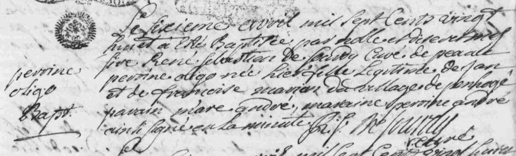 | Prénom | Perrine | | Nom de famille | Oligo | | Profession | Gens de labeur | Le sixieme avril mil sept cents vingt huit a esté baptisée par ... ... ... .... René Sebastien de Souvoycuré de Péaule Perrine Oligo née hier fille légitime de Jean et de Françoise Marion du village de Panhogé Parain Marc André, marraine Perrrine André .... signé en la .... | Naissance (plus...) | 5 avril 1728 | Péaule, Morbihan, FRANCE (, Péaule, 56153, Morbihan, Bretagne, France) | | Baptême | 6 avril 1728 | Péaule, Morbihan, FRANCE (, Péaule, 56153, Morbihan, Bretagne, France) | Témoins au Bapteme/Naissance | Parrain Marc André Marraine Perrine André