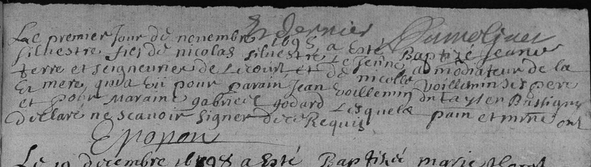 | Prénom | Jean | | Nom de famille | Sylvestre | | Naissance | 1 novembre 1698 | Val-de-Meuse, Haute-Marne, FRANCE (, Lecourt, 52332, Haute Marne, Grand-Est, France) | | Baptême | 1 novembre 1698 | Val-de-Meuse, Haute-Marne, FRANCE (, Lecourt, 52332, Haute Marne, Grand-Est, France) | | Décès | après 1759 à l'âge de 61 ans | Val-de-Meuse, Haute-Marne, FRANCE (, Maulain, 52332, Haute Marne, Grand-Est, France) |