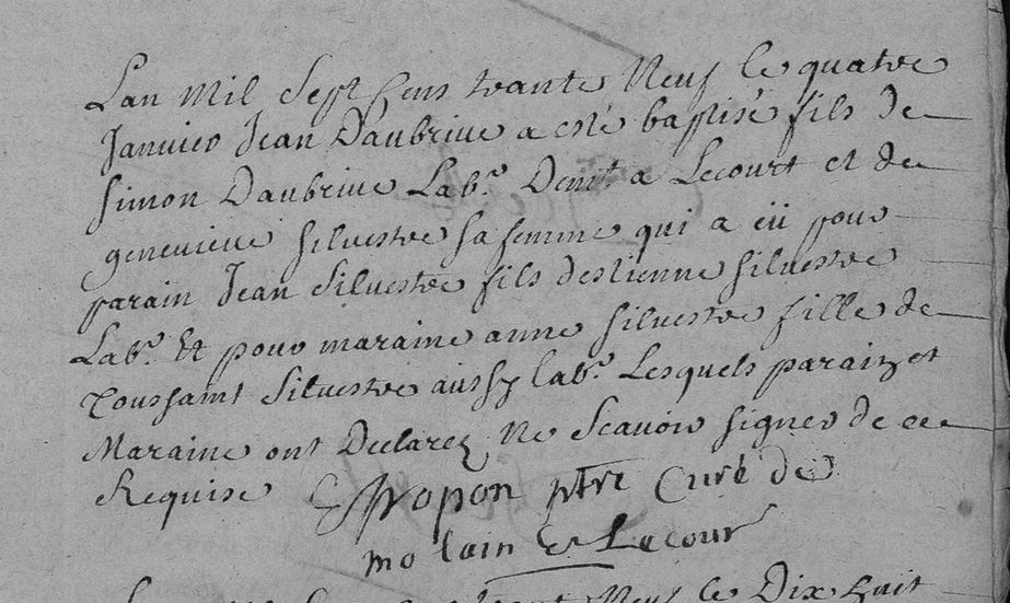 | Prénom | Jean | | Nom de famille | Daubrine | | Naissance | 4 janvier 1739 | Val-de-Meuse, Haute-Marne, FRANCE (, Lecourt, 52332, Haute Marne, Grand-Est, France) | | Baptême | 4 janvier 1739 | Val-de-Meuse, Haute-Marne, FRANCE (, Lecourt, 52332, Haute Marne, Grand-Est, France) | | Décès | 10 mars 1819 à l'âge de 80 ans | Val-de-Meuse, Haute-Marne, FRANCE (, Lecourt, 52332, Haute Marne, Grand-Est, France) |