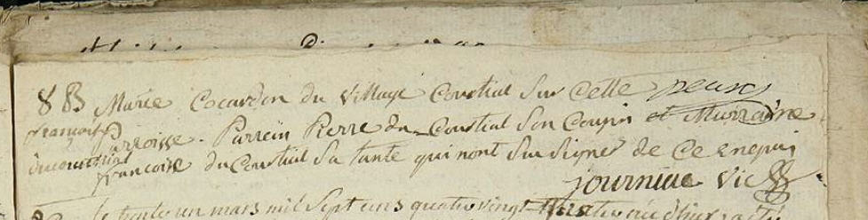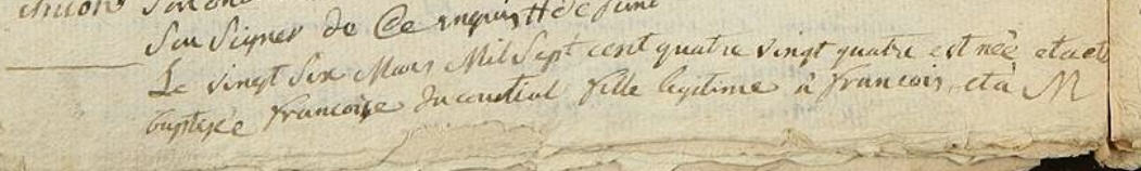 | Prénom | Françoise | | Nom de famille | Ducourtial | Le vingt six mars mil sept cent quatre vingt quatre est née et a été baptisée Françoise Ducourtial fille légitime à François et à Marie Cocardon du village courtial sur Celle. ...Paroisse - Parrain Pierre du Courtial son ? et Marraine Françoise du courtial sa tante qui n'ont su signer de ce requis | Naissance (plus...) | 26 mars 1784 | Saint-Hilaire, Puy-de-dôme, FRANCE (, Saint-Hilaire-Près-Pionsat, 63360, Puy de Dôme, Auvergne-Rhône-Alpes, France) | | Baptême | 26 mars 1784 | Saint-Hilaire, Puy-de-dôme, FRANCE (, Saint-Hilaire-Près-Pionsat, 63360, Puy de Dôme, Auvergne-Rhône-Alpes, France) | Témoins au Bapteme/Naissance | Oncle Pierre Ducourthial (5 janvier 1746) Tante Françoise Ducourthial (? - 9 mars 1813)