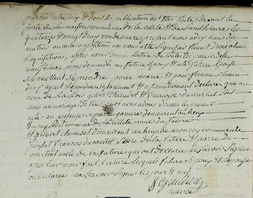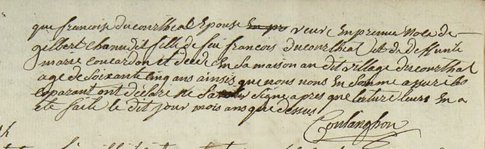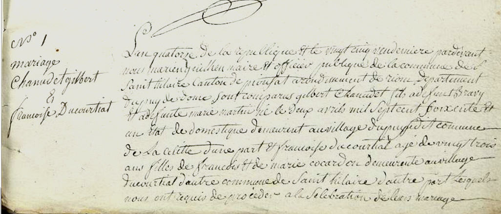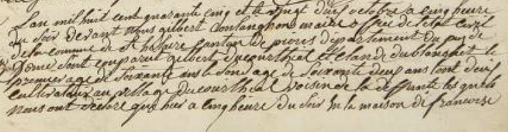 | L'an mil huit cent quarante cinq et le vingt deux octobre à six heures du soir devant nous gilbert coulanghon maire officier de l'état civil de la commune de saint hilaire canton de pieres... département du puy de dome sont comparus gilbert ducourtial et claude dublanchet le premier agé de soixante ans le second agé de soixante deux ans tout deux ... au village du courthial voisin de la deffunte lesquels nous ont déclaré que hier à cinq heures du soir sur la maison de françoise que françoise ducourthil épouse veuve en première noce de Gilbert Chanudet et fille de feu françois ducourthial et de marie coucardon est décédé en sa maison au dit villag ducourthial agée de soixante cinq ans ainsi que nous nous en sommes assuré les parents ont déclaré ne savoir signer après que lecture leur en a été faite le dit jour mois ainsi que dessus | Décès (plus...) | 21 octobre 1845 à l'âge de 61 ans | Saint-Hilaire, Puy-de-dôme, FRANCE (, Saint-Hilaire-Près-Pionsat, 63360, Puy de Dôme, Auvergne-Rhône-Alpes, France) |