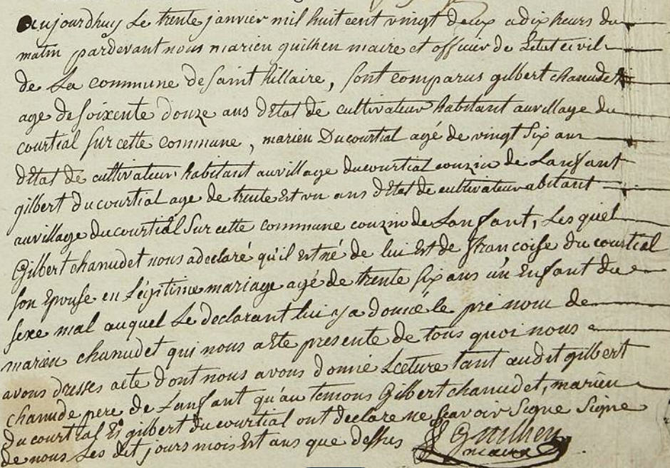 Aujourd'hui le trente janvier mil huit cent vingt deux à dix heures du matin pardevant nous marien Guilhen maire et officier de l'état civil de la commune de saint Hillaire, sont comparus Gilbert Chanudet agé de soixante douze ans d'état de cultivateur habitant au village du courtial sur cette commune, Marien Ducourtial agé de vingt six ans d'état de cultivateur habitant au village du courtial cousin de l'enfant, Gilbert ducourtial agé de trente et un ans d'état de cultivateur habitant au village du Courtial sur cette commune cousin de l'enfant lesquel Gilbert Chanudet nous a déclaré qu'il est né de lui et de Françoise Ducourtial son épouse en légitime mariage agé de trente six ans un enfant de sexe mal auquel le déclarant lui a donné le prénom de Marien Chanudet et qui nous a été présenté de tous quoi nous avons dressé acte dont nous avons donné lecture tant audit Gilbert Chanudet pere de l'enfant qu'aux témoins Gilbert Chanudet, Marien Ducourtalet Gilbert Ducourtal ont déclaré ne savoir signer , signé de nous ses dit jours mois et ans que d...