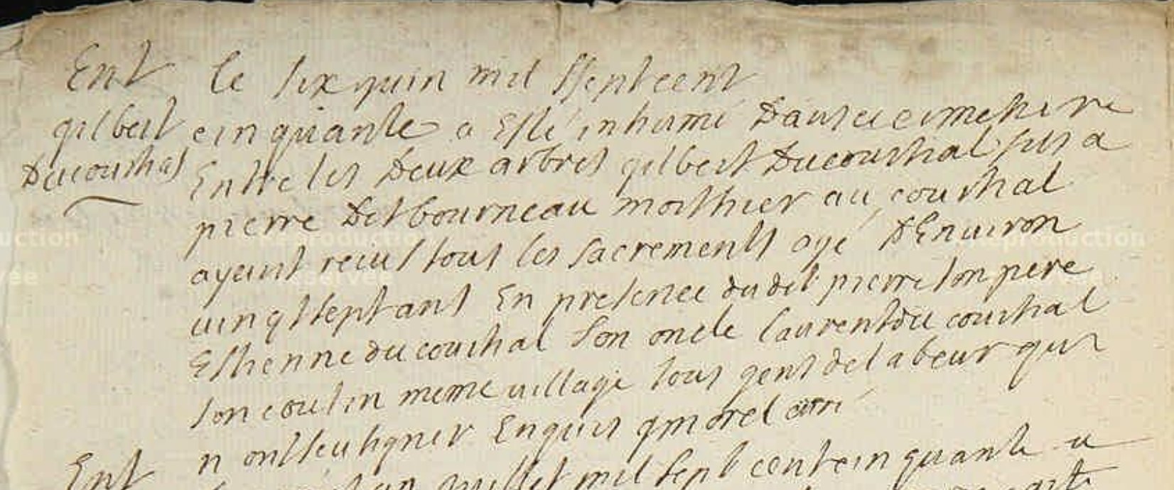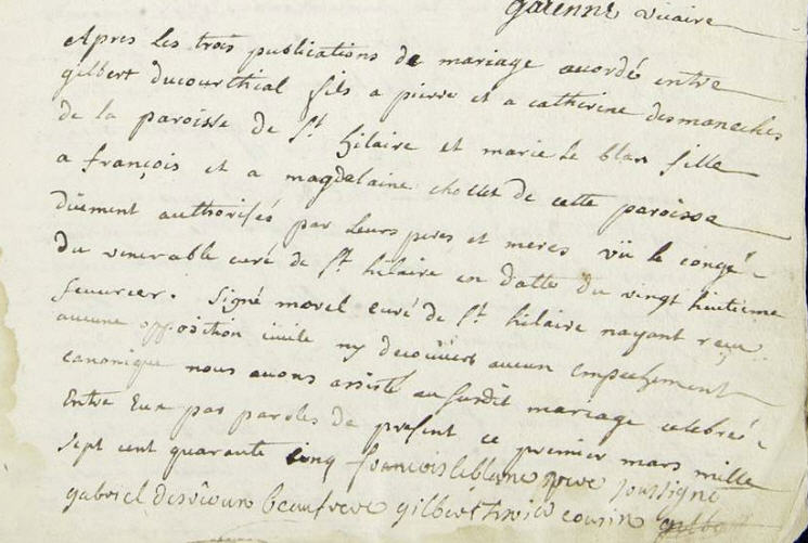 | Union | Marie Leblanc 629 (2 mai 1716 - 1 janvier 1787) | Après les trois publications de mariage accordés entre gilbert ducourthial fils à pierre et à catherine demaneches de la paroisse de saint hilaire et marie le blan fille à françois et à magdelaine chollet de cette paroisse dument autorisés par leurs peres et meres vu le congé du vénérable curé de saint hilaire en datte du vingt huitieme février. signé ... curé de saint hilaire n'ayant recu aucune opposition civile ny découvert aucun empechement entre eux pas par des de. ...ce premier mars mille sept cent quarante cinq françois leblanc ,soussigné gabriel desvioum ... gilbert tisseier cousins pierre ducourtial estionne ducourtial oncle qui n ons sus signé de ce requis | Mariage (plus...) | 1 mars 1745 à l'âge de 22 ans | Saint-Maigner, Puy-de-dôme, FRANCE (, Saint-Maigner, 63373, Puy de Dôme, Auvergne-Rhône-Alpes, France) | Enfant(s) | François Ducourthial 314 (? - 26 septembre 1820)