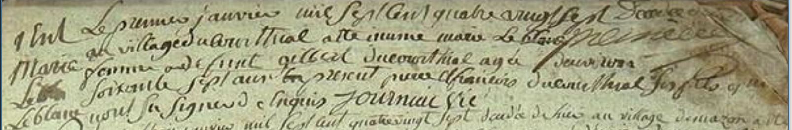 | Prénom | Marie | | Nom de famille | Leblanc | Acte non trouvé sur ADs 63 ? | Naissance (plus...) | 2 mai 1716 | Saint-Maigner, Puy-de-dôme, FRANCE (, Saint-Maigner, 63373, Puy de Dôme, Auvergne-Rhône-Alpes, France) | | Baptême | 2 mai 1716 | Saint-Maigner, Puy-de-dôme, FRANCE (, Saint-Maigner, 63373, Puy de Dôme, Auvergne-Rhône-Alpes, France) | Le premier janvier mil sept cent quatre vingt sept,, décédée hier au village du Courthial a été inhumée Marie Leblanc, femme à déffunt Gilbert Ducourthial, âgée d'environ soixante sept ans - Présents, Pierre et François Ducourthial ses fils qui n'ont su signer de ce enquis . Journiac, vic. | Décès (plus...) | 1 janvier 1787 à l'âge de 71 ans | Saint-Hilaire, Puy-de-dôme, FRANCE (, Saint-Hilaire-Près-Pionsat, 63360, Puy de Dôme, Auvergne-Rhône-Alpes, France) | Témoins Décès | Témoin François Ducourthial 314 (? - 26 septembre 1820) Témoin Pierre Ducourthial (5 janvier 1746)