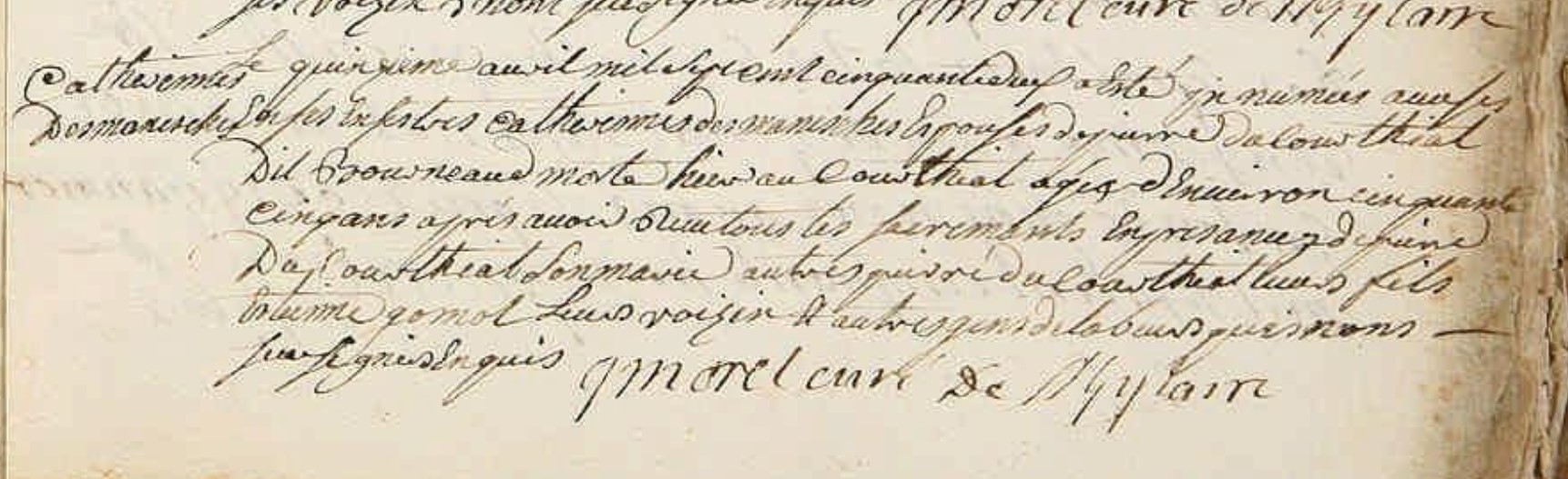 | Prénom | Catherine | | Nom de famille | Desmaneche | | Naissance | 1697 | | le quinzieme avril mil sept cent cinquante deux a esté inhumé .... ... catherine Desmanesches epouse de pierre ducourthial du bourneaud morte hier au courthial agée d'environ cinquante cinq ans après avoir recu tous les sacrements en présence de pierre ducourthial son mari, d'autres pierre ducourthial ... fils estienne gomot leurs voisins et autres gens de labeur qui nont ... signées enquis. g morel curé de ..ylain | Décès (plus...) | 14 avril 1752 à l'âge de 55 ans | Saint-Hilaire, Puy-de-dôme, FRANCE (, Saint-Hilaire-Près-Pionsat, 63360, Puy de Dôme, Auvergne-Rhône-Alpes, France) |