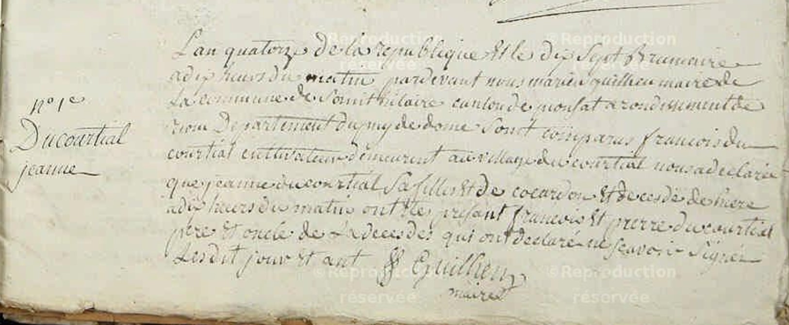 | Prénom | Jeanne | | Nom de famille | Ducourthial | | Naissance | 5 mars 1782 | Saint-Hilaire, Puy-de-dôme, FRANCE (, Saint-Hilaire-Près-Pionsat, 63360, Puy de Dôme, Auvergne-Rhône-Alpes, France) | | Baptême | 5 mars 1782 | Saint-Hilaire, Puy-de-dôme, FRANCE (, Saint-Hilaire-Près-Pionsat, 63360, Puy de Dôme, Auvergne-Rhône-Alpes, France) | | Décès | 8 novembre 1805 à l'âge de 23 ans | Saint-Hilaire, Puy-de-dôme, FRANCE (, Saint-Hilaire-Près-Pionsat, 63360, Puy de Dôme, Auvergne-Rhône-Alpes, France) |