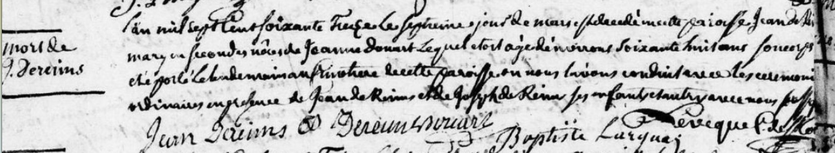 l'an mil sept cent soixante treize le septieme jour de mars est décedé en cette paroisse Jean Dereims mary en seconde noces de Jeanne Douart lequel érait âgé d'environ soixante huit ans, son corps a été porté le lendemain en terre de cette paroisse ou nous l'avons conduit avec les cérémonies ordinaires en présence de Jean de Reims et de Joseph de Reims ses enfants et autres ... ...