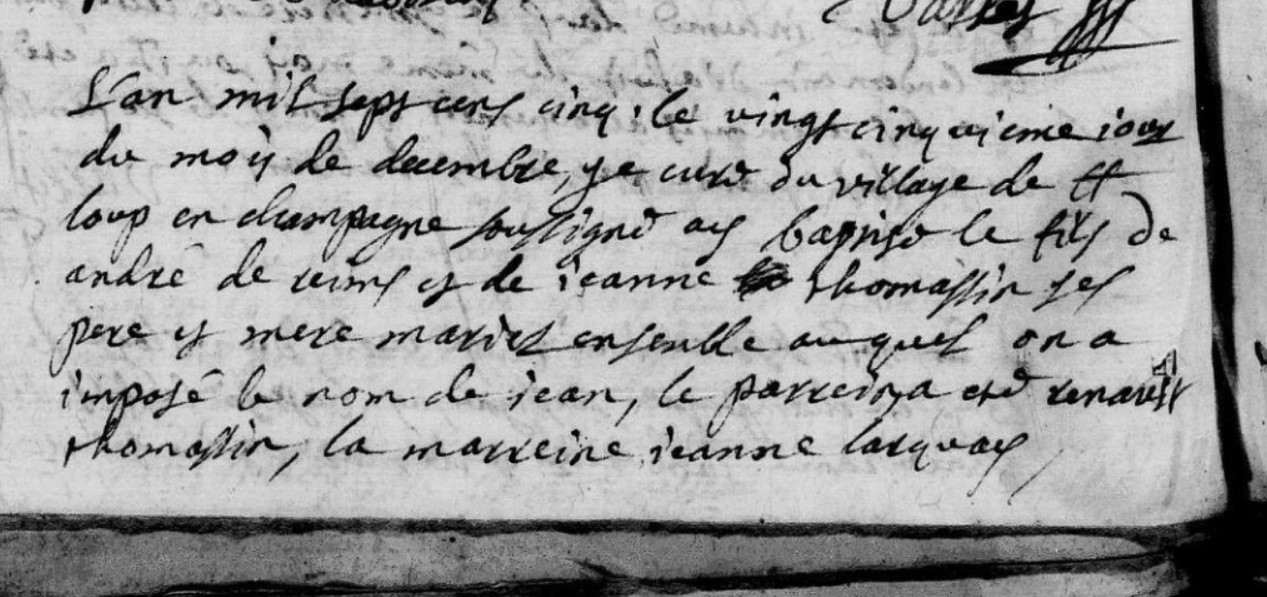 l'an mil sept cens cinq le vingt cinquieme jour du mois de decembre, j'ay curé du village de st loup en champagne soussigné ay baptisé le fils de André de Reims et de Jeanne Thomassin ses pere et mere mariés ensemble auquel on a imposé le nom de Jean, le parrain a été Renault Thomassin, la marraine Jeanne Larquay