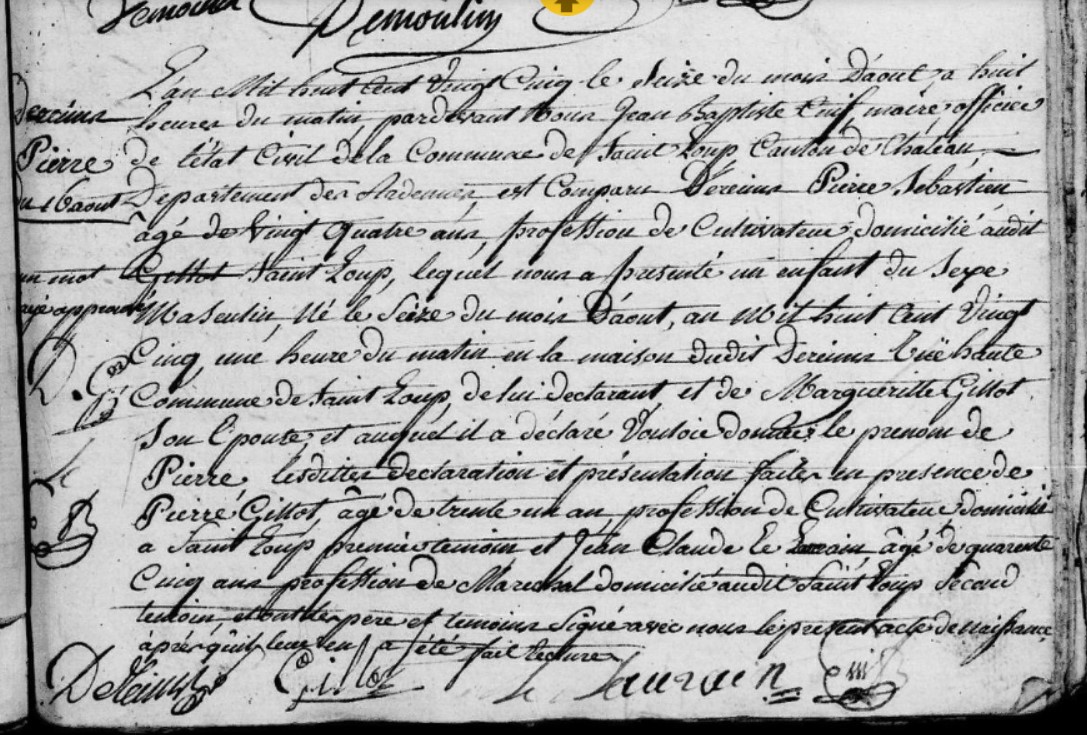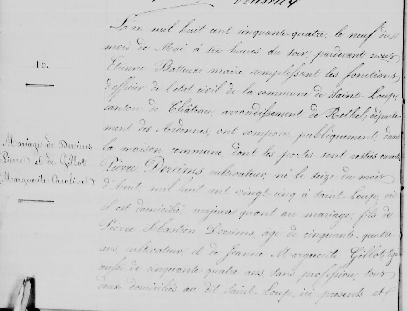 | Prénom | Pierre | | Nom de famille | Dereims | l'an mil huit cent vingt cinq le seize du mois d'aout a huit heures du matin pardevant nous Jean Baptiste Couf maire officier de l'état Civil de la Commune de Saint Loup, canton de Chateau, département des Ardennes, est comparu Dereims Pierre Sebastien âgé de vingt quatre ans, profession de cultivateur, domicilié audit Saint Loup, lequel nous a présenté un enfant du sexe, Masculin, né le seize du mois d'aout, an mil huit cent vingt cinq une heure du matin en la maison dudit Dereims rue haute? commune de Saint Loup, de lui déclarant et de Marguerite Gillot son épouse, et auquel il a déclaré vouloir donné le prénom de Pierre, lesdittes déclaration et présentation faites en présence de Pierre Gillot âgé de trente un ans, profession de cultivateur, domicilié à Saint Loup premier témoin et Jean Claude le Laurain âgé de quarante cinq ans profession de Marechal domicilié audit Saint Loup second témoin .... le pere et témoins signe avec nous le présent acte de naissance après qu'il leur a été fait lecture | Naissance (plus...) | 16 août 1825 | Saint-Loup-en-Champagne, Ardennes, FRANCE (, Saint-Loup-en-Champagne, 08386, , Grand-Est, Franceai) | | Décès | après 1875 à l'âge de 50 ans | |