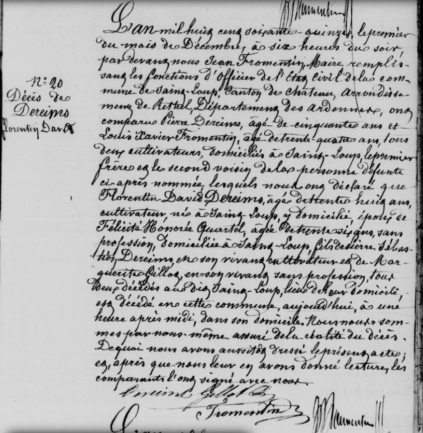 | Prénom | Florentin David | | Nom de famille | Dereims | | Naissance | 1837 | Saint-Mandé, Val-de-Marne, FRANCE (, Saint-Mandé, 94067, Val de Marne, Île-de-France, France) | | Décès | 1 décembre 1875 à l'âge de 38 ans | Saint-Loup-en-Champagne, Ardennes, FRANCE (, Saint-Loup-en-Champagne, 08386, , Grand-Est, Franceai) |