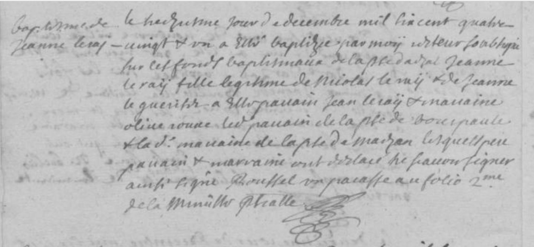 Témoins au Bapteme/Naissance | Parrain Nicolas Le Ray 1120 (autour de 1647 - 1 décembre 1722) Marraine Olive Rouxe