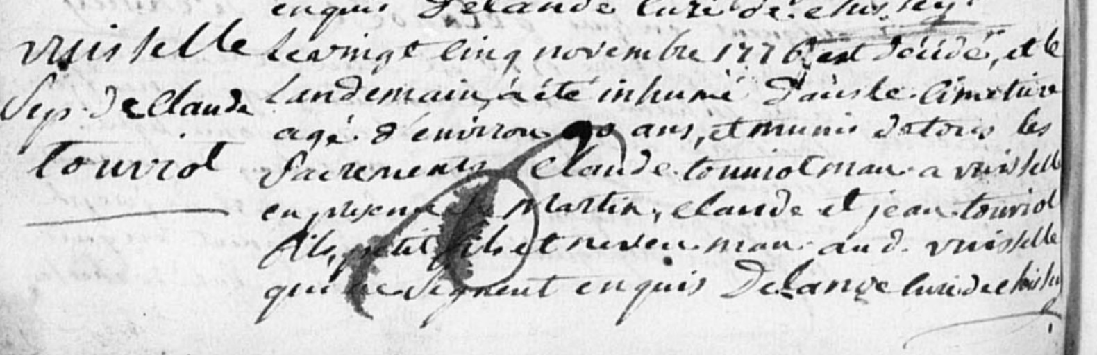| Prénom | Claude | | Nom de famille | Touviot | | Naissance | 10 octobre 1686 | Cussy-en-Morvan, Saône-et-Loire, FRANCE (, Cussy-en-Morvan, 71165, Saône et Loire, Bourgogne-Franche-Comté, France) | | Décès | 25 novembre 1776 à l'âge de 90 ans | Chissey-en-Morvan, Saône-et-Loire, FRANCE (, Chissey-en-Morvan, 71129, Saône et Loire, Bourgogne-Franche-Comté, France) |