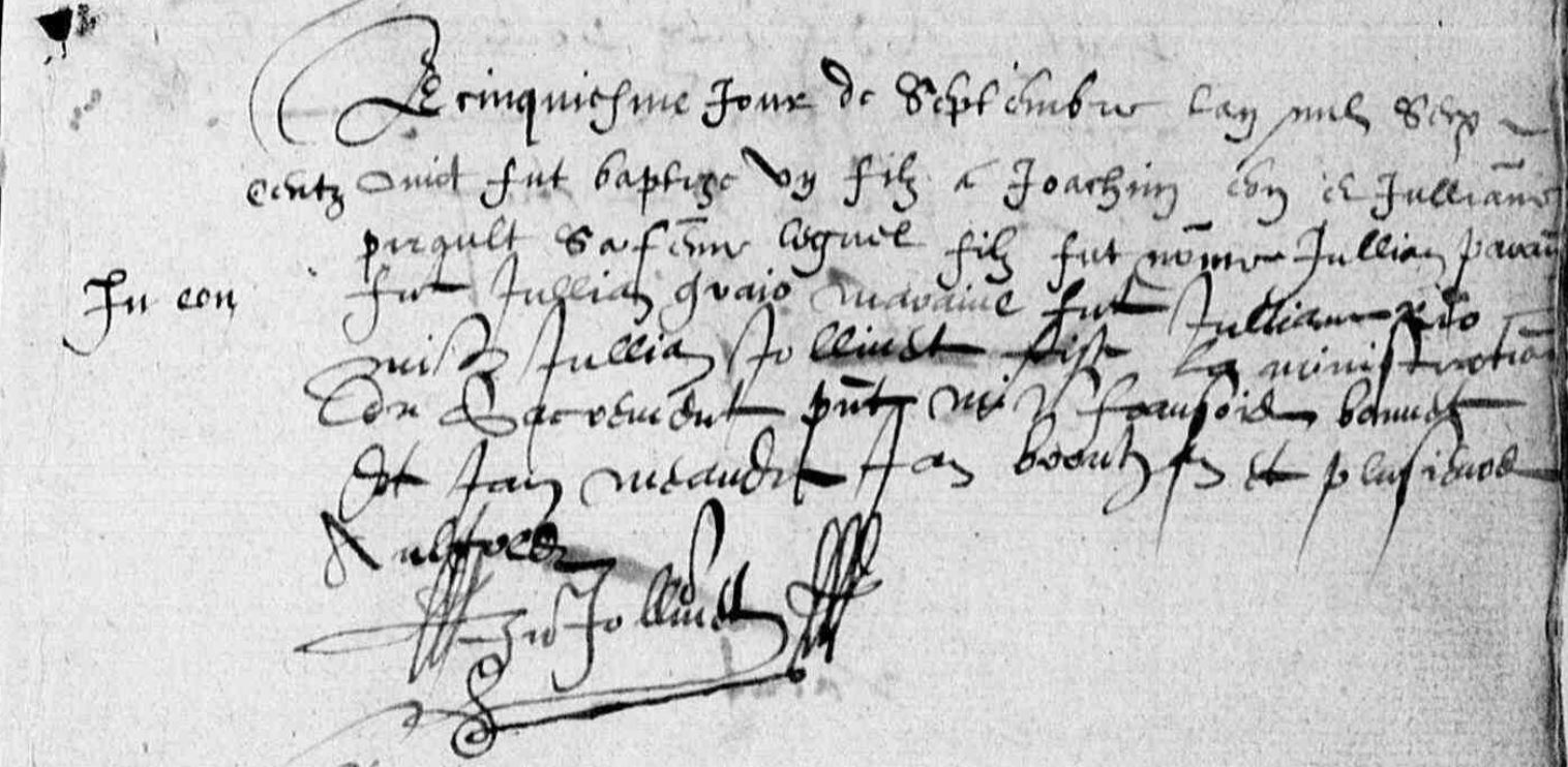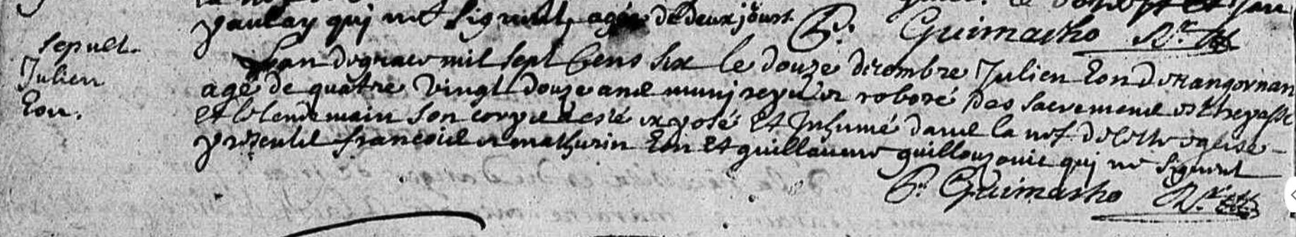 | Prénom | Julien | | Nom de famille | Eon | | Naissance | 5 septembre 1608 | Limerzel, Morbihan, FRANCE (, Limerzel, 56220, Morbihan, Bretagne, France) | | Baptême | 5 septembre 1608 | Limerzel, Morbihan, FRANCE (, Limerzel, 56220, Morbihan, Bretagne, France) | l'an de grace mil sept cens six le douze decembre Julien Eon d... agé de quatre vingt douze ans ... .... ... sacrements ... et le lendemain son coprt a esté ... et inhumé dans la nef de .. église ... ... ... mathurin Eon et Guillaume Guillouzouic qui ne signent | Décès (plus...) | 12 décembre 1706 à l'âge de 98 ans | Noyal-Muzillac, Morbihan, FRANCE (, Noyal-Muzillac, 56149, Morbihan, Bretagne, France) | | Sépulture | 13 décembre 1706 | Noyal-Muzillac, Morbihan, FRANCE (, Noyal-Muzillac, 56149, Morbihan, Bretagne, France) |