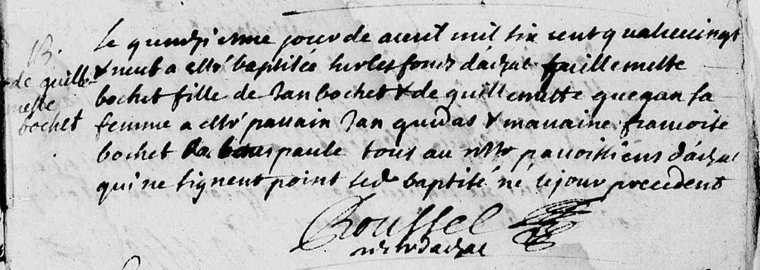 | Prénom | Guillemette | | Nom de famille | Bochet | | Naissance | 14 avril 1689 | Arzal, Morbihan, FRANCE (, Arzal, 56004, Morbihan, Bretagne, France) | | Baptême | 14 avril 1689 | Arzal, Morbihan, FRANCE (, Arzal, 56004, Morbihan, Bretagne, France) | Témoins au Bapteme/Naissance | Parrain Jean Guidas Marraine Françoise Bochet (1660)
