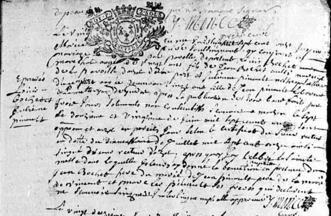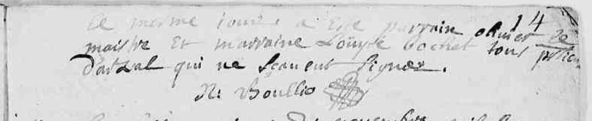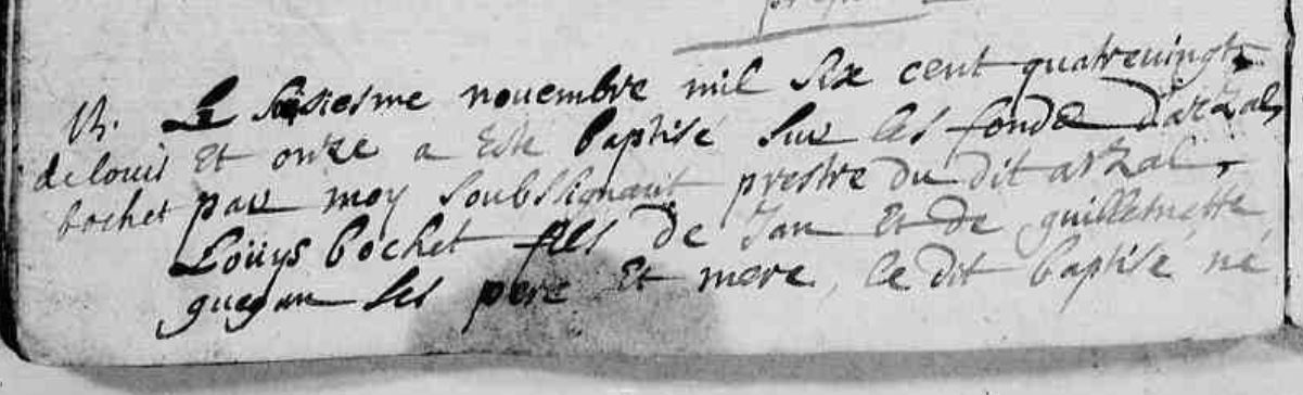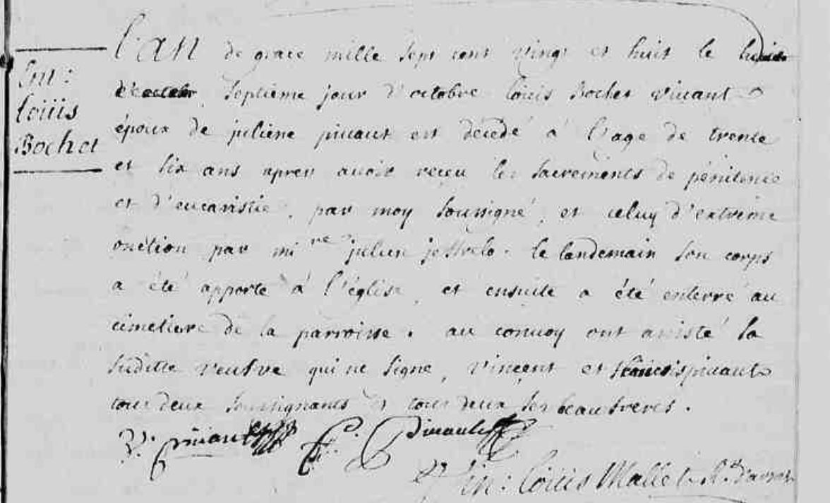 | Prénom | Louis | | Nom de famille | Bochet | | Naissance | 6 novembre 1691 | Arzal, Morbihan, FRANCE (, Arzal, 56004, Morbihan, Bretagne, France) | | Baptême | 6 novembre 1691 | Arzal, Morbihan, FRANCE (, Arzal, 56004, Morbihan, Bretagne, France) | l'an de grace mille sept cent vingt et huit le septieme jour d'octobre Loüis Bochet vivant époux de Julienne Pinaut est décédé à l'age de trente et six ans après avoir reçu les sacrements de pénitence et d'eucaristie. par moy soussigné, et celuy d'extreme onction par m. Julien... le lendemain son corps a été apporté à l'église et ensuite a été enterré au cimetiere de la paroisse au convoy ont assisté la susdite veuve qui ne signe, Vincent et François Pinaut tous deux soussignantsn tous deux les beaufreres (Signature) V.Pinaut, F.Pinaut et Loüis Mallet.. d'arzal | Décès (plus...) | 7 octobre 1728 à l'âge de 37 ans | Arzal, Morbihan, FRANCE (, Arzal, 56004, Morbihan, Bretagne, France) |