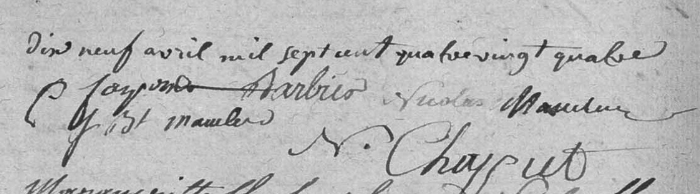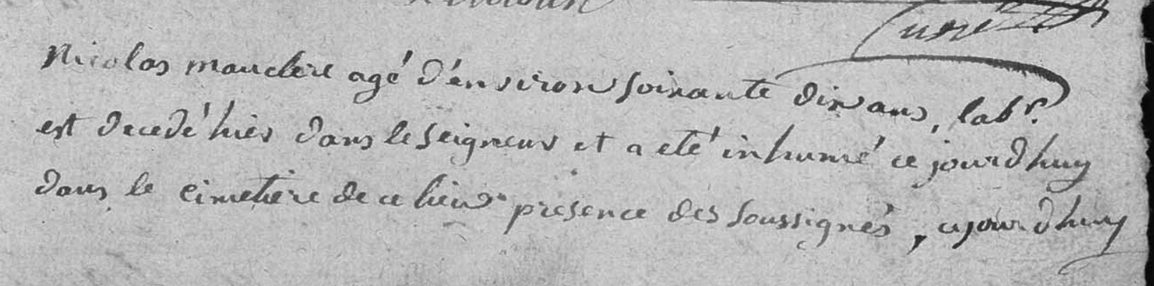 | Prénom | Nicolas | | Nom de famille | Maucler | | Profession | Laboureur | | Naissance | 4 mai 1714 | Noyers, Haute-Marne, FRANCE (, Noyers, 52358, Haute Marne, Grand-Est, France) | | Baptême | 4 mai 1714 | Noyers, Haute-Marne, FRANCE (, Noyers, 52358, Haute Marne, Grand-Est, France) | Nicolas Mauclere agé d'environ soixante dix ans, laboureur est decedé hier dans le seigneur et a été inhumé ce jourd'huy dans le cimetiere de ce lieu présence des soussignés ce jour d'hier dix neuf avril mil sept cent quatre vingt quatre | Décès (plus...) | 18 avril 1784 à l'âge de 70 ans | Noyers, Haute-Marne, FRANCE (, Noyers, 52358, Haute Marne, Grand-Est, France) |