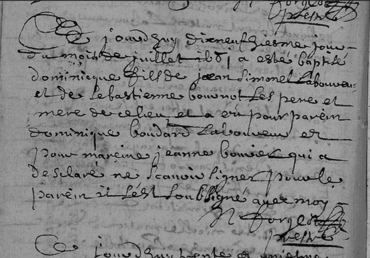 Ce jourd'hui dix neufiesme jour du mois de Juillet 1681 a esté baptisé Dominique fils de Jean Simonel laboureur et de Sebastienne Bournot ses pere et mere de ce lieu et a eu pour parrain dominique Boudard laboureur et pour marraine Jeanne Bonnier qui a déclaré ne savoir signer et pour le parrain il s'est soussigné avec moy