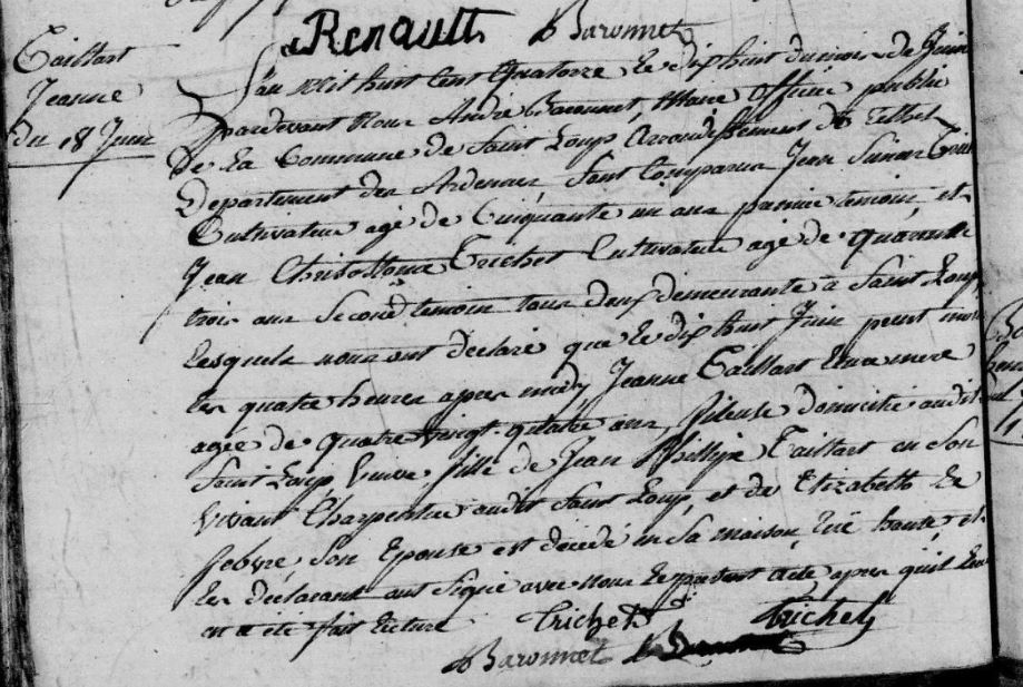 | Prénom | Jeanne | | Nom de famille | Taillart | L'an mil huit cent quatorze le dix huit du mois de juin pardevant nous andré Bonnet maire officier public de la commune de saint loup arrondissement de ..... département des Ardennes, sont comparus Jean S.... cultivateur agé de cinquante un an .... et jean chrisostome Trichet cultivateur agé de quarante trois ans second temoin tous deux demeurants à saint loup lesquels nous ont declarés que le dix huit juin .... en quatre heures apres midi, Jeanne Taillard ... agée de quatre vingt quatre ans,.... domiciliée audit saint louo .... fille de Jean Phillipe Taillar en son vivant charpentier audit saint loup et de Elizabeth le febvre son épouse est décédée en la maison .... les déclarants ont signé avec nous le present acte après quoi leur en a été fait lecture | Décès (plus...) | 3 juin 1814 | Saint-Loup-en-Champagne, Ardennes, FRANCE (, Saint-Loup-en-Champagne, 08386, , Grand-Est, Franceai) |
