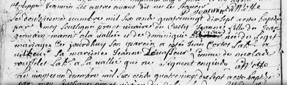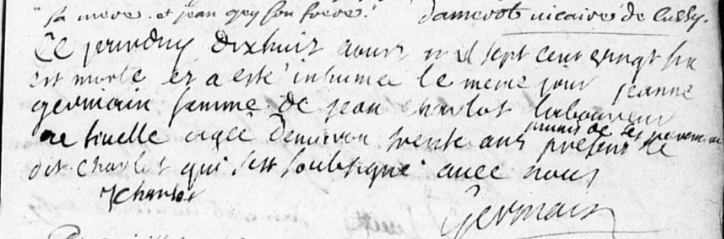 | Prénom | Jeanne | | Nom de famille | Germain | | Profession | Laboureur | le douzieme decembre mil six cent quatrevingt dix sept a esté baptisé par moy soussigné pretre et vicaire de Cussy, Jeanne fille de jean germain mann. à la vallée et de dominique bigeard née de legal mariage ce jourd'huy son parrain a esté Jean Cortot Laboureur en ?? Sa marraine Heanne Lanerflfemme de nicola.. rousselet laboureur à la vallée qui ne signent enqu.. | Naissance (plus...) | 12 décembre 1697 | Cussy-en-Morvan, Saône-et-Loire, FRANCE (, Cussy-en-Morvan, 71165, Saône et Loire, Bourgogne-Franche-Comté, France) | | Baptême | 12 décembre 1697 | Cussy-en-Morvan, Saône-et-Loire, FRANCE (, Cussy-en-Morvan, 71165, Saône et Loire, Bourgogne-Franche-Comté, France) | | Décès | 17 août 1726 à l'âge de 29 ans | Cussy-en-Morvan, Saône-et-Loire, FRANCE (, Cussy-en-Morvan, 71165, Saône et Loire, Bourgogne-Franche-Comté, France) |