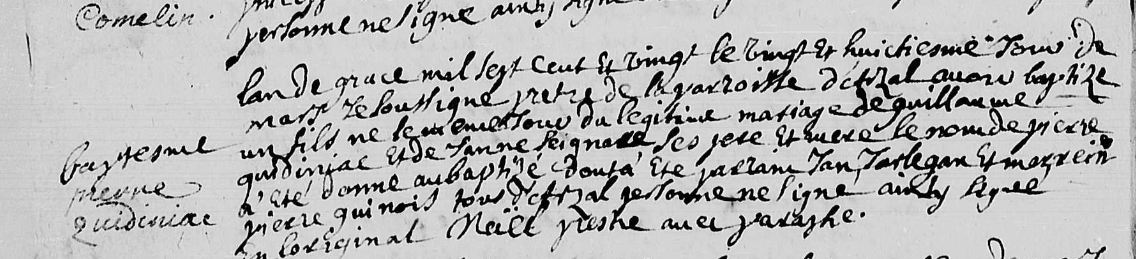 | Prénom | Pierre | | Nom de famille | Quidinial | | Naissance | 28 mars 1720 | Arzal, Morbihan, FRANCE (, Arzal, 56004, Morbihan, Bretagne, France) | | Baptême | 28 mars 1720 | Arzal, Morbihan, FRANCE (, Arzal, 56004, Morbihan, Bretagne, France) | Témoins au Bapteme/Naissance | Parrain Jan Jarlegan