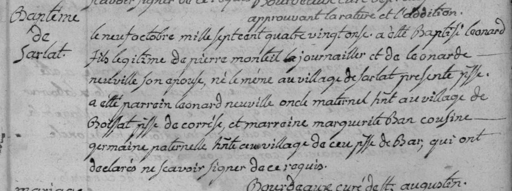 | Prénom | Léonard Dit Jean | | Nom de famille | Monteil | | Profession | Cultivateur | le neuf octobre mille sept cent quatre vingt onze a été baptisé Léonard fils légitime de Pierre Monteil Journallier et de Léonarde Neuville son épouse, né le même au village de Sarlat présente paroisse a été parrain Léonard Neuville oncle maternel habitant au village de Brossat paroisse de corrèze, et marraine Marguerite Ban cousine Germaine paternelle habitante au village de Ceu paroisse de Bar qui ont déclarés ne seavoir signer de ce requis | Naissance (plus...) | 9 octobre 1791 | Saint-Augustin, Corrèze, FRANCE (Sarlat, Saint-Augustin, 19181, Corrèze, Nouvelle-Aquitaine, France) | | Baptême | 9 octobre 1791 | Saint-Augustin, Corrèze, FRANCE (, Saint-Augustin, 19181, Corrèze, Nouvelle-Aquitaine, France) | Témoins au Bapteme/Naissance | Oncle maternel Léonard Neuville (1 septembre 1765 - 18 septembre 1830) Cousine Germaine maternelle Marguerite Ban