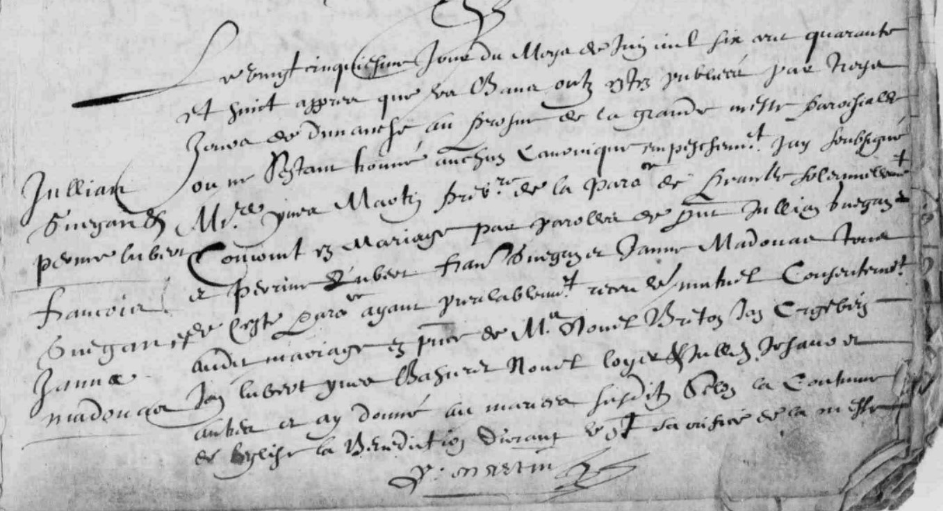 | Notes | le même jour, remariage du père : Guegan Jullian avec Lubert Perrine et mariage de son fils Guegan François avec Madouas Jeanne. |