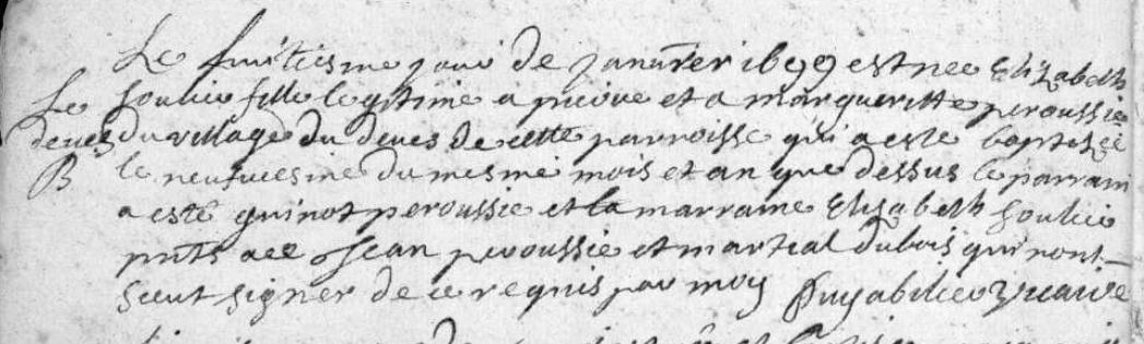| Prénom | Elisabeth | | Nom de famille | Soulier | | Naissance | 8 janvier 1699 | Bar, Corrèze, FRANCE (Deves, Bar, 19016, Corrèze, Nouvelle-Aquitaine, France) | | Baptême | 9 janvier 1699 | Bar, Corrèze, FRANCE (Deves, Bar, 19016, Corrèze, Nouvelle-Aquitaine, France) |