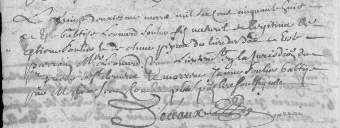 Le vingt deuieme mars mil six cent cinquante huit a été baptisé Léonard Soulier fils naturel et légitime de Estienne Soulier et de Anne Pigeon du .... Bar a eté parrain M... Léonard Craux...