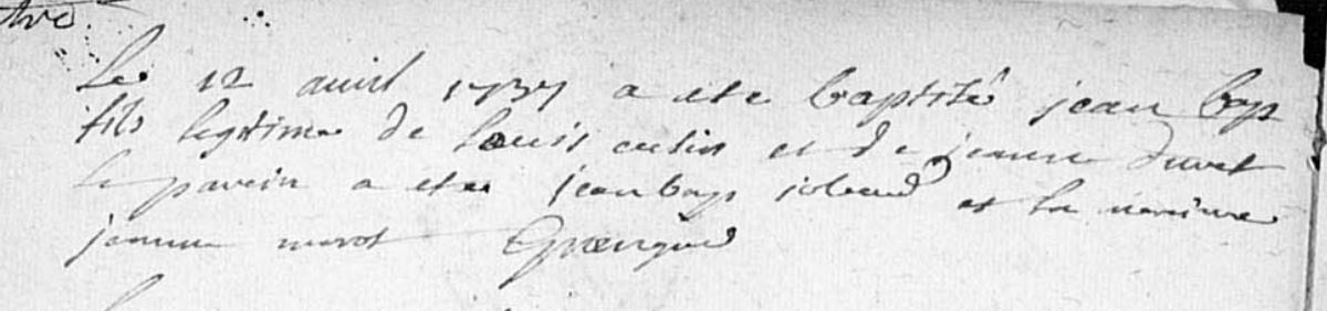 | Prénom | Jean-Baptiste | | Nom de famille | Cuzin | | Naissance | 12 avril 1737 | Cussy-en-Morvan, Saône-et-Loire, FRANCE (, Cussy-en-Morvan, 71165, Saône et Loire, Bourgogne-Franche-Comté, France) | | Baptême | 14 avril 1737 | Cussy-en-Morvan, Saône-et-Loire, FRANCE (, Cussy-en-Morvan, 71165, Saône et Loire, Bourgogne-Franche-Comté, France) |